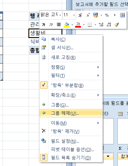 피벗에서 머리글이나 다른 영역을 클릭하면