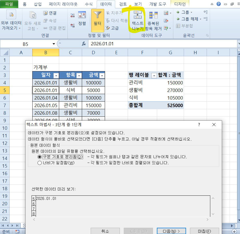 - 열 데이터 형식에서 날짜(YMD 등) 선택 → 완료