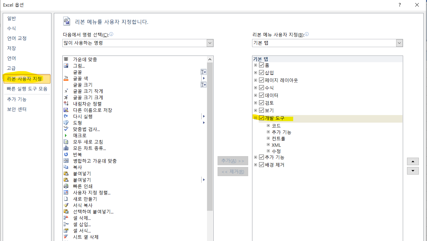 상단 메뉴에 개발 도구 탭이 생깁니다.