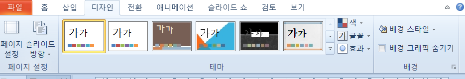 디자인 메뉴에서는 슬라이드 테마, 색상, 배경 설정 등을 변경할 수 있습니다.